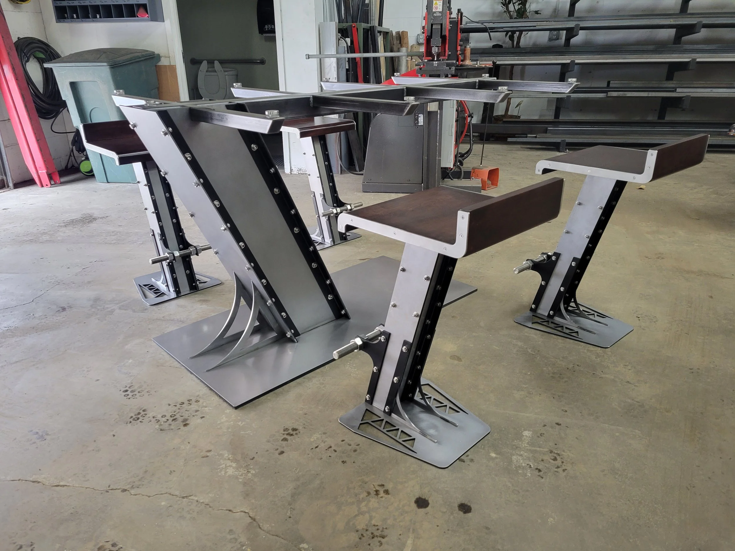 Our extraordinary custom cantilever dining set—a true one-of-a-kind masterpiece. This exceptional piece was meticulously designed and fabricated to fulfill our customer's desire for something truly original, industrial, and substantial. Countless hours of dedication went into every aspect of this creation, resulting in a dining set that surpasses expectations.